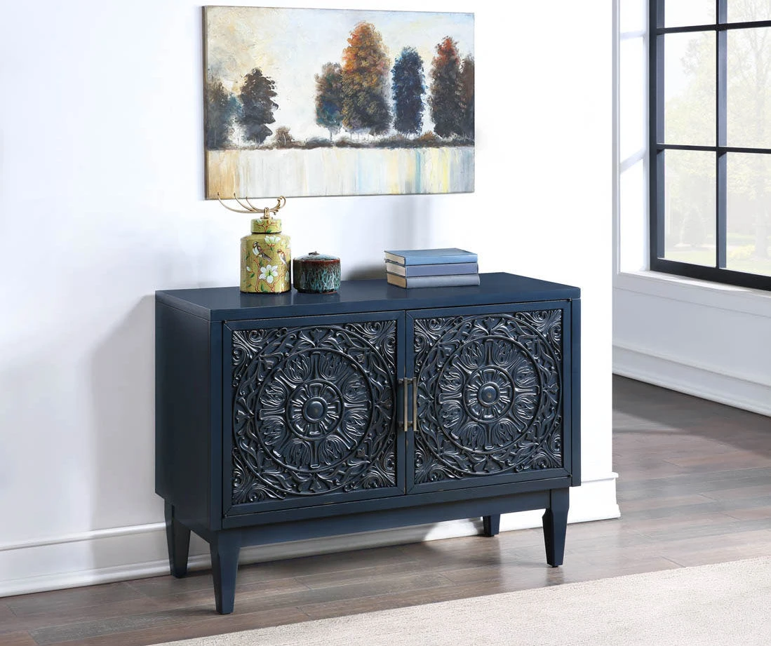 The Riley accent cabinet from Real Living is great for your media, storage and display needs. Finished in a hand painted fresco blue, each door features ornate medallion carvings that provide a decorative way to accent your home. The interior reveals adjustable shelves, ventilation and wire management to accomodate your media components in a living or entertaining space.