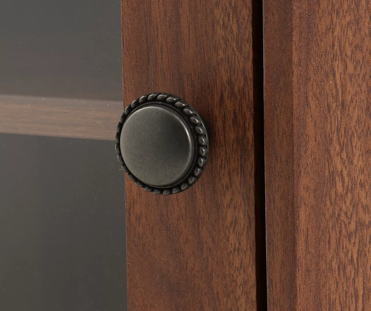 • Features 2 glass doors on either side with adjustable shelves for storage