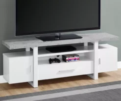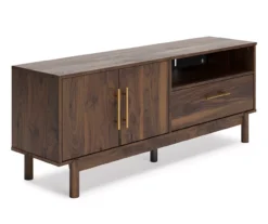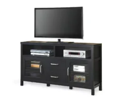 Store and entertain with this TV stand from Real Living. The classic design in a black finish features open compartments for all your media equipment needs as the cabinets and drawer stores away accessories, DVDs and more. It’s a casual addition to a living space, den or basement.