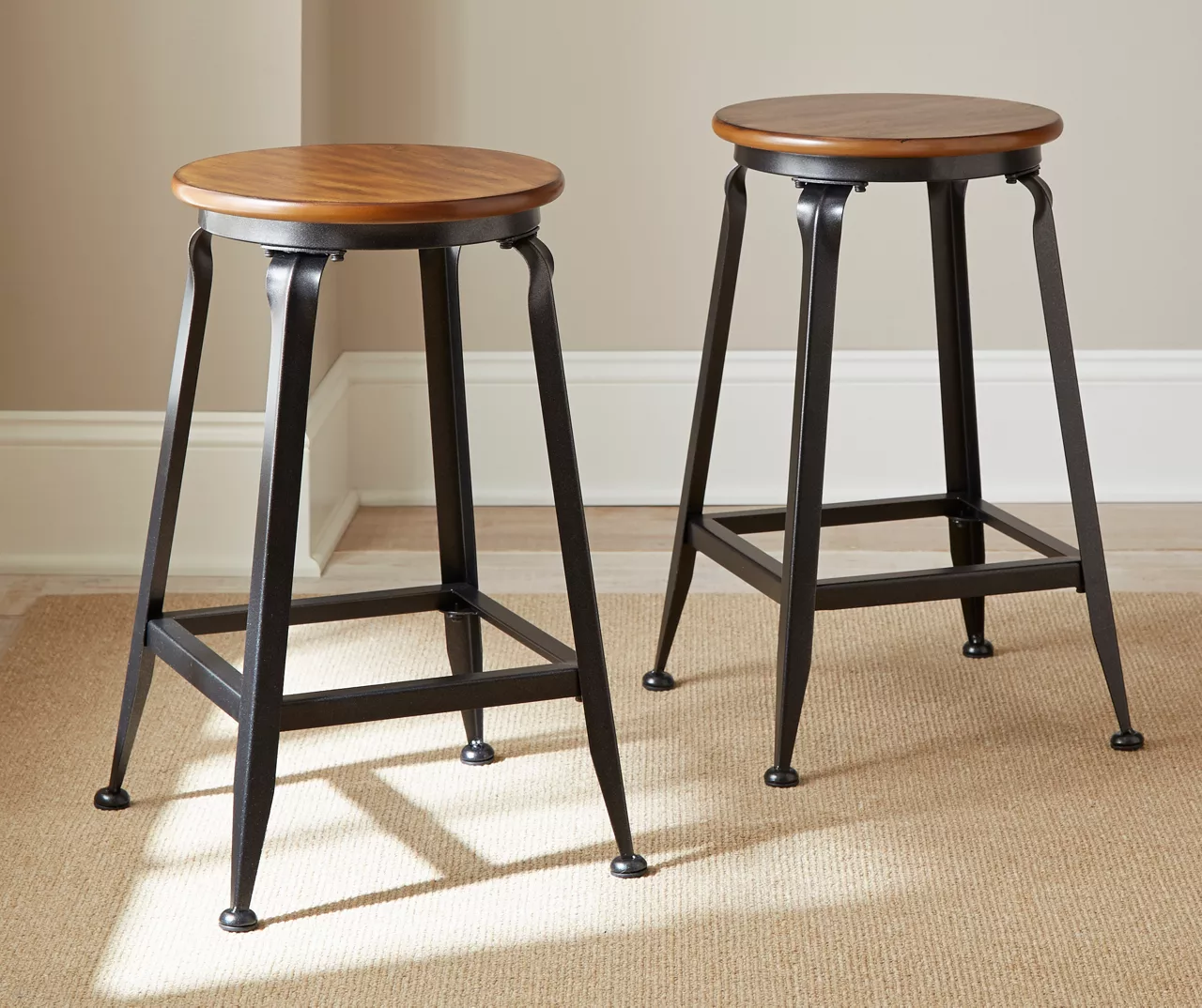 Bring a mixed media, industrial vibe to your kitchen, dining room or basement using these stunning Adele counter-height barstools. Each backless stool is simply designed with hand-tooled metal bases and birch veneer seats in a rich brown finish.