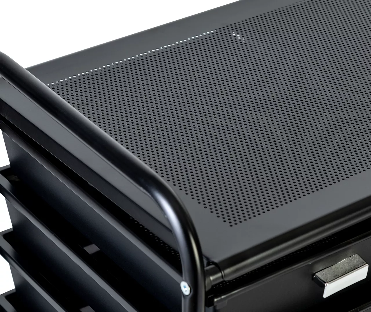 • Locking wheels secure the cart to work on its ample tabletop surface