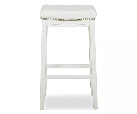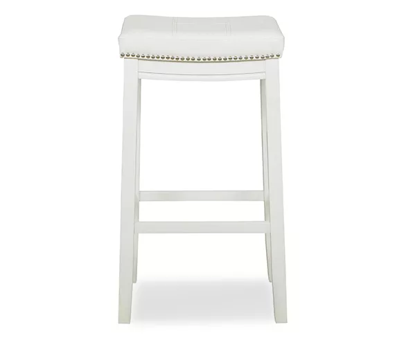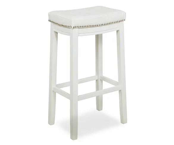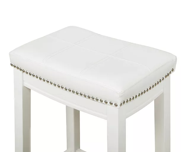 This best selling bar stool helps to make any kitchen or parlor room welcoming to guests and family, no matter the occasion. A comfortable padded seat is upholstered with faux leather and fastened with double needle stitching for added durability. Shiny silver nail head trim lines the cushion, while white paint covers the solid wood frame to provide a regal aesthetic.