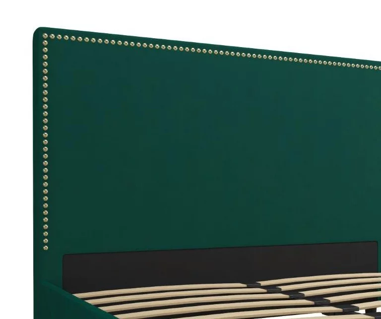 - Modern glam design with a gold headboard nailhead trim