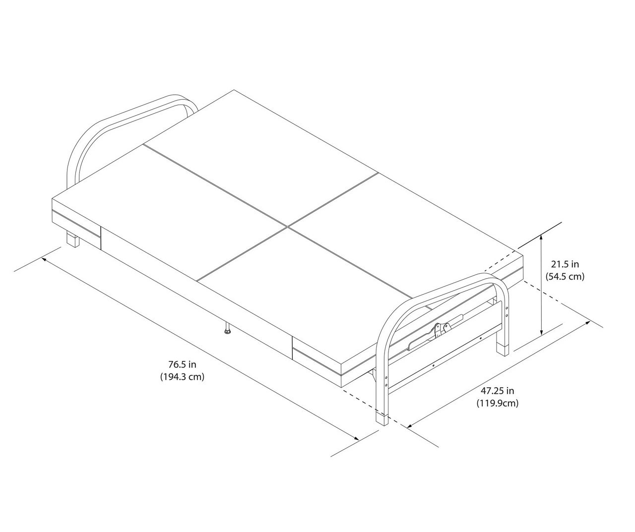 - Futon dimensions: 76.5”L x 33.5”W x 33.5”H