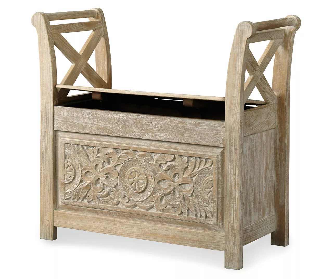 Get a dose of bohemian bliss with this accent bench. The whitewashed wood finish fits in effortlessly with your existing décor. A carved floral pattern beautifully covers the bottom front as X-design arms entice from above. Ready for more? Lift the seat for plenty of storage action underneath.