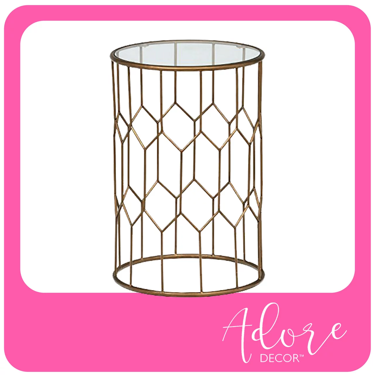 For a way to lighten bulky indoor decor, inject a touch of Hollywood regency with this open-concept accent table. Inspired by modern artwork, it combines a clear glass tabletop and brushed gold base for a hint of glamour. The round pillar-shaped base features a geometric design. The clear tempered glass top is perfect for showcasing floral arrangements, decor, or magazines. High end finishes of glass and gold make it easy to add sophistication to the living room, bedroom, or entryway.