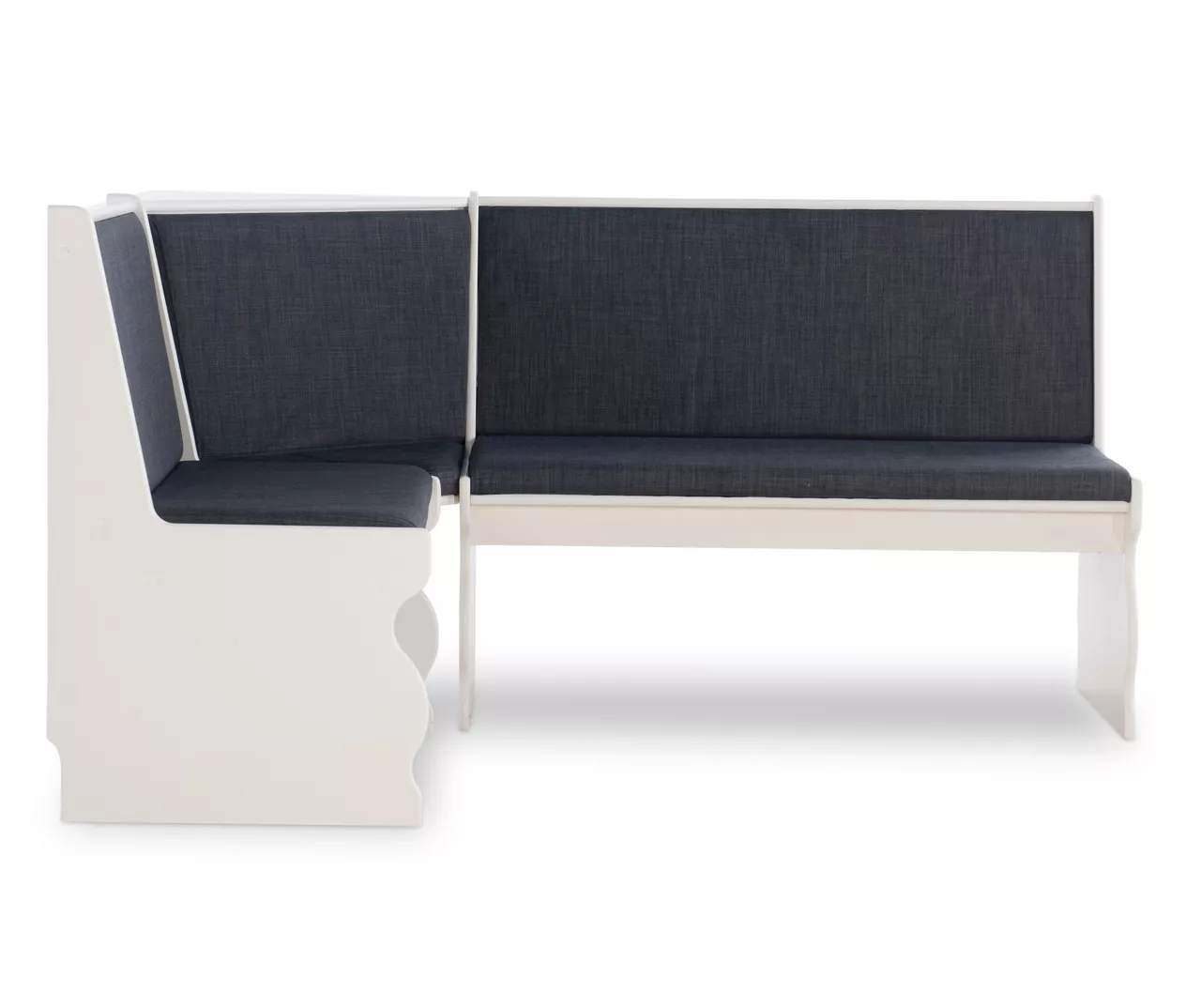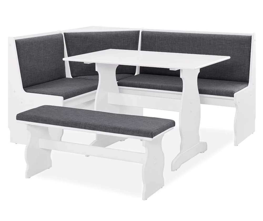 Create cozy kitchen comfort even in the tiniest of spaces with this lovely Maggie dining nook! Padded seating in charcoal gray pairs well with the classic white look of the set’s pine constructed frame. Generously sized to accommodate up to five people, this wonderful furniture set is perfect for any corner of your kitchen.